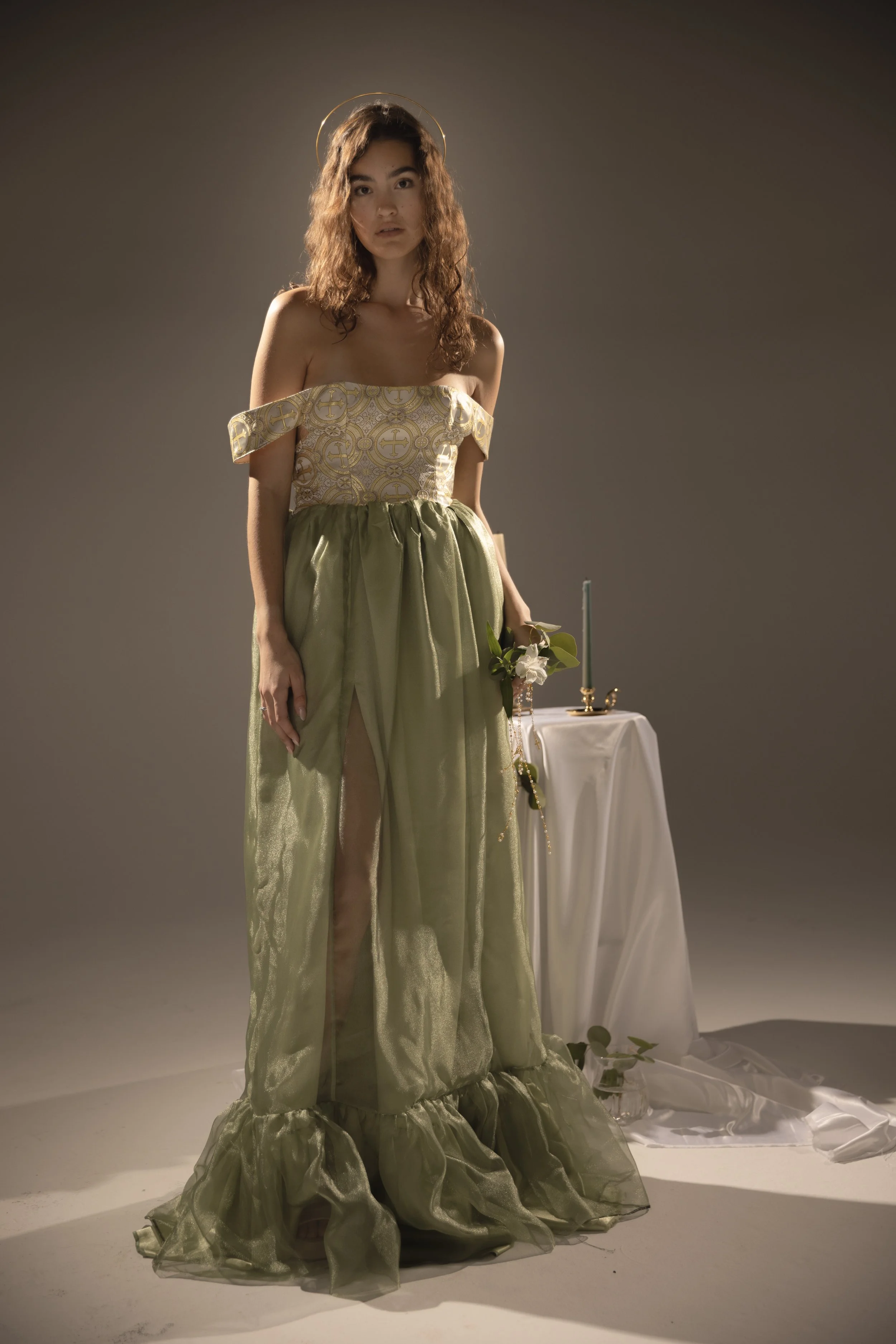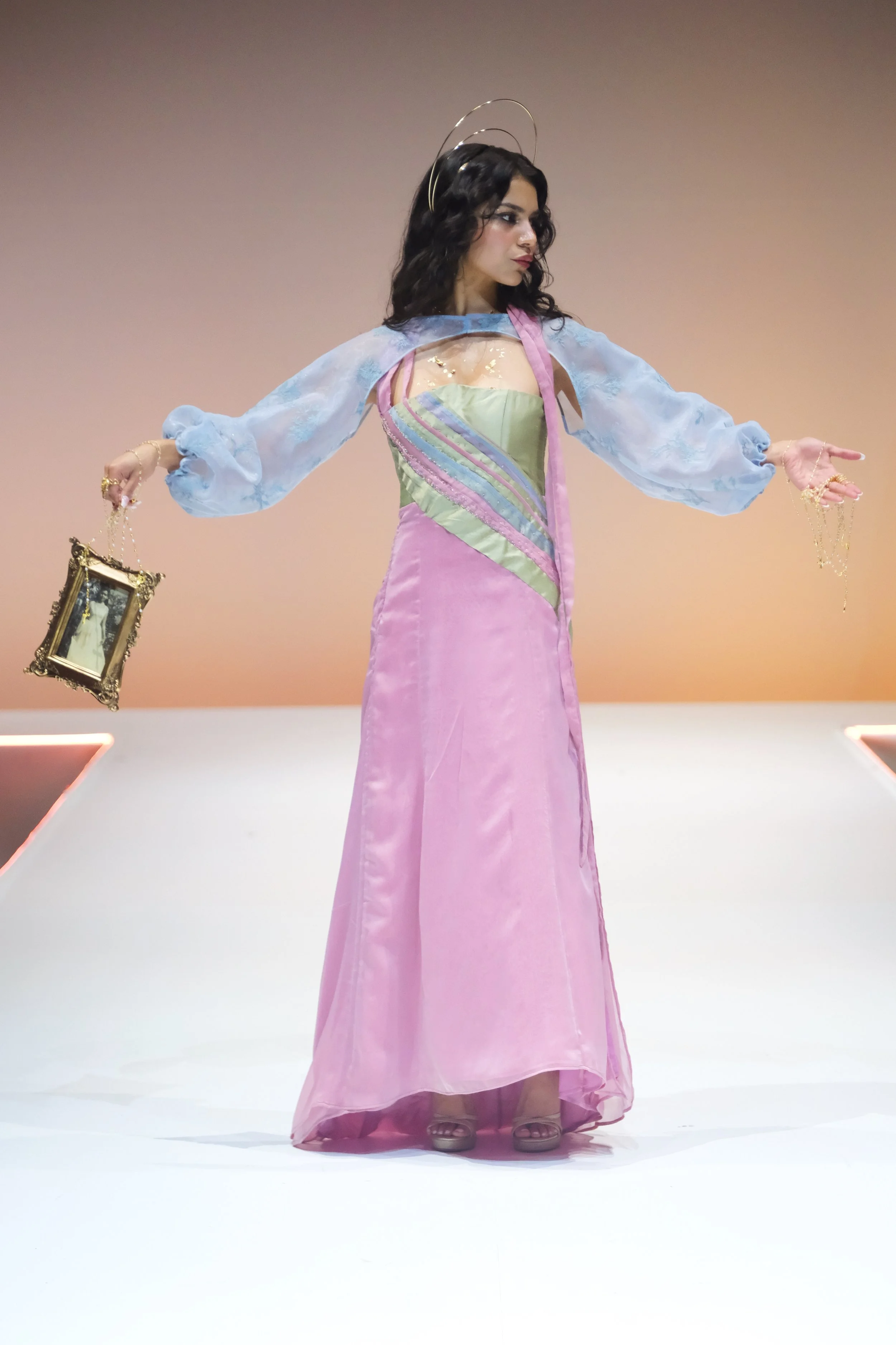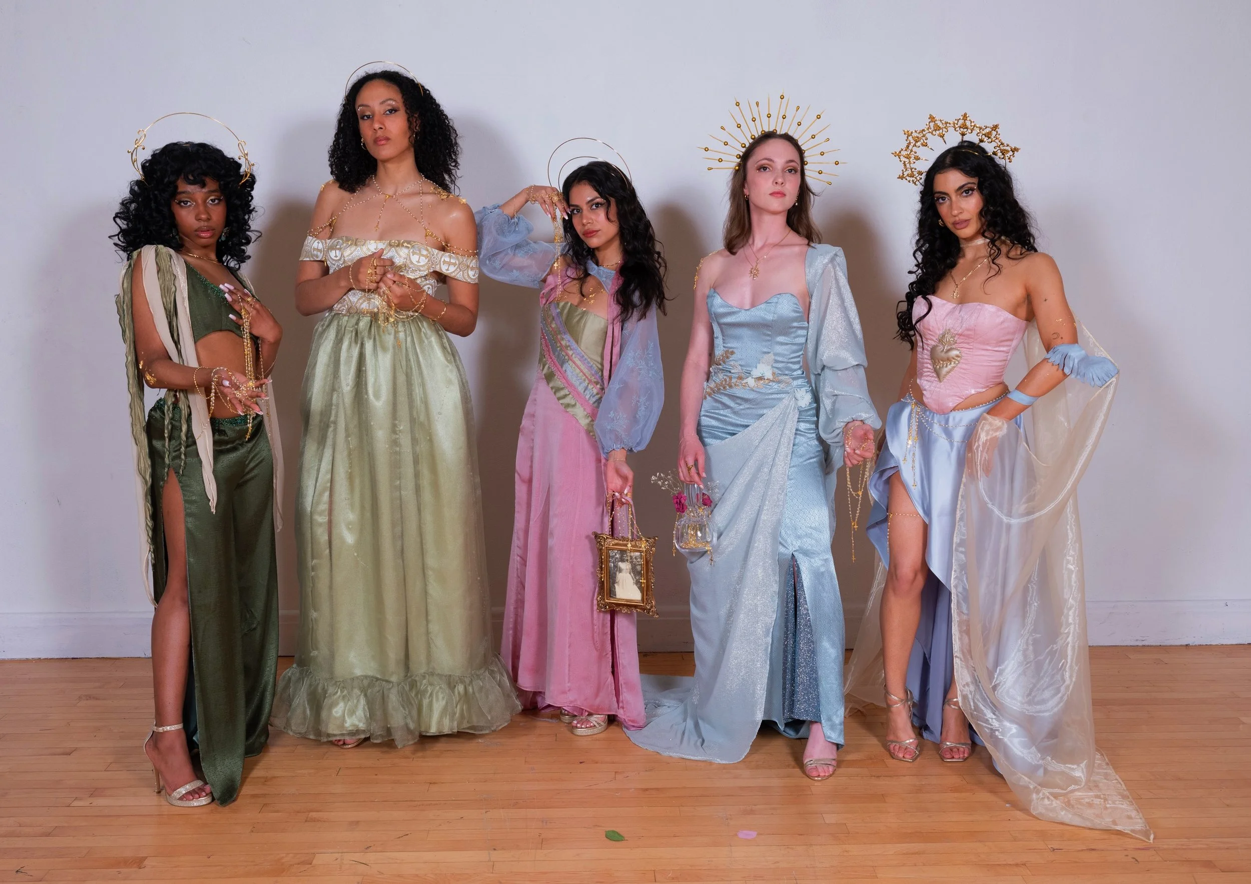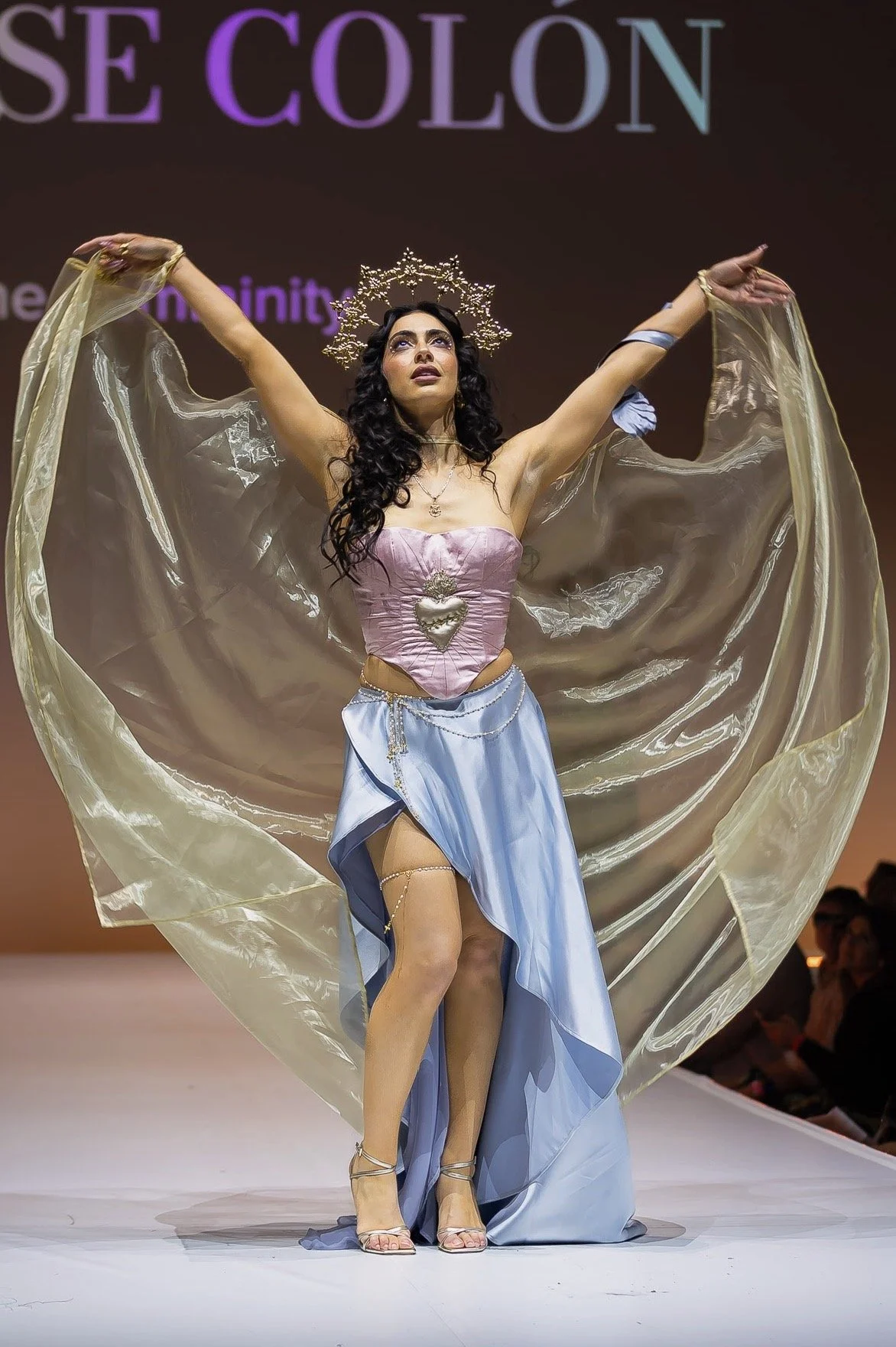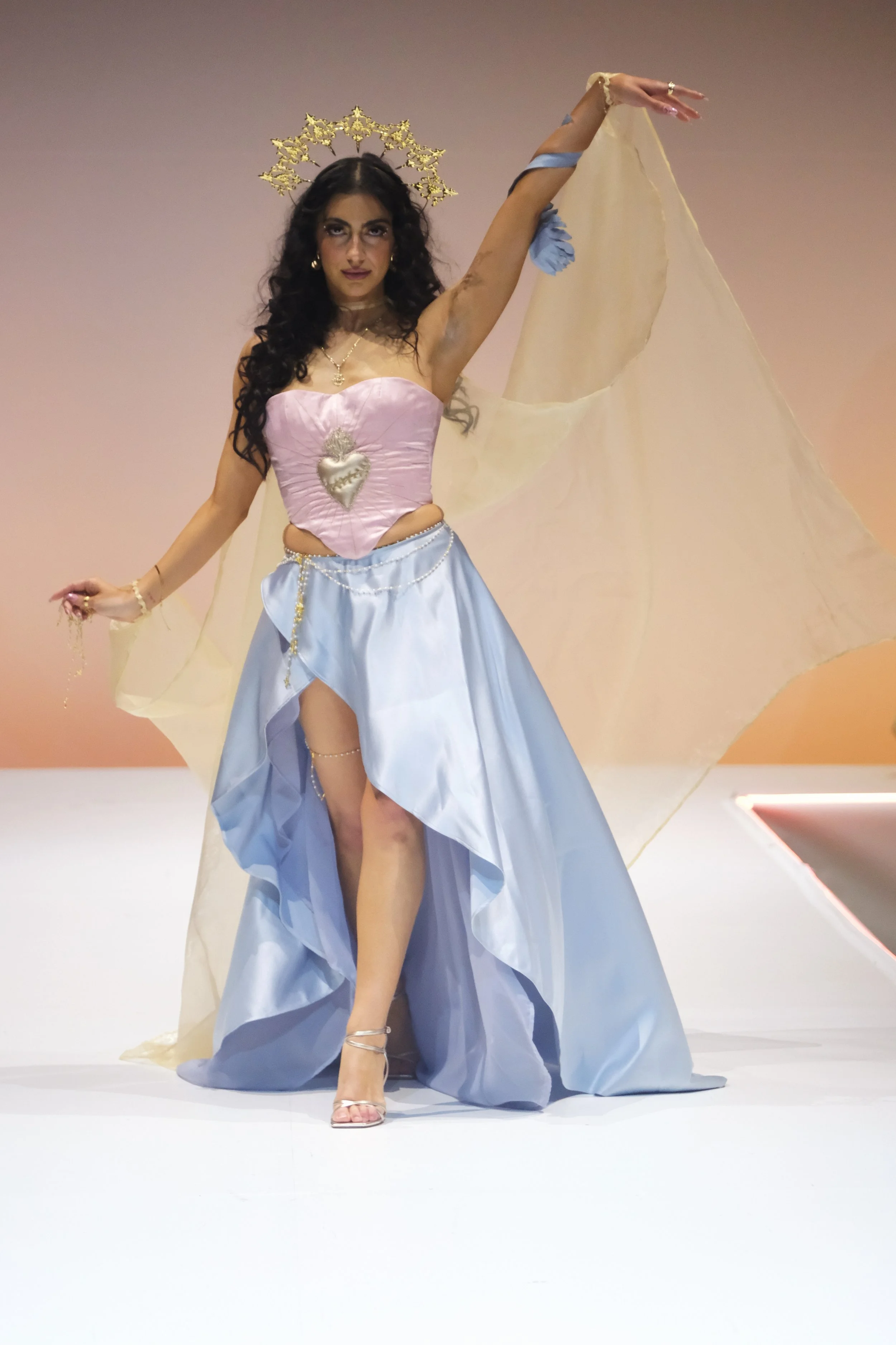 Influenced by my upbringing in a Hispanic Catholic household, where women often struggle for recognition despite being the foundation, my couture collection is a tribute to the empowering female figures in my family. They shaped my perception of femininity with their confidence, empathy, and strength. I weave this narrative in my designs through motifs that represent family ties, Catholicism, and love.